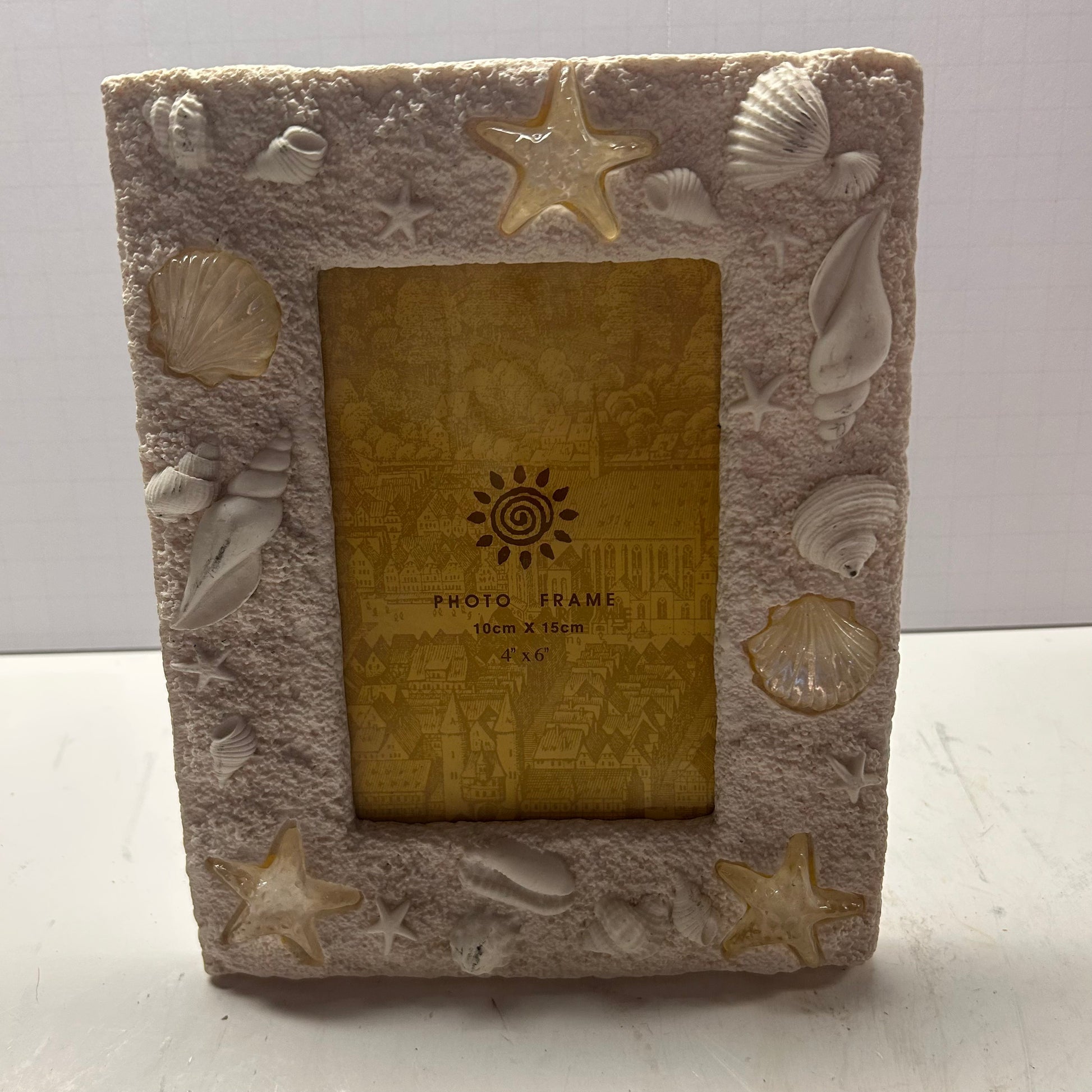 This beach themed picture frame features a beautiful seashell and starfish border, perfect for showcasing your favorite beach vacation memories. The intricate design adds a coastal touch to any room. Crafted with high quality materials, this frame is a must-have for any beach lover.