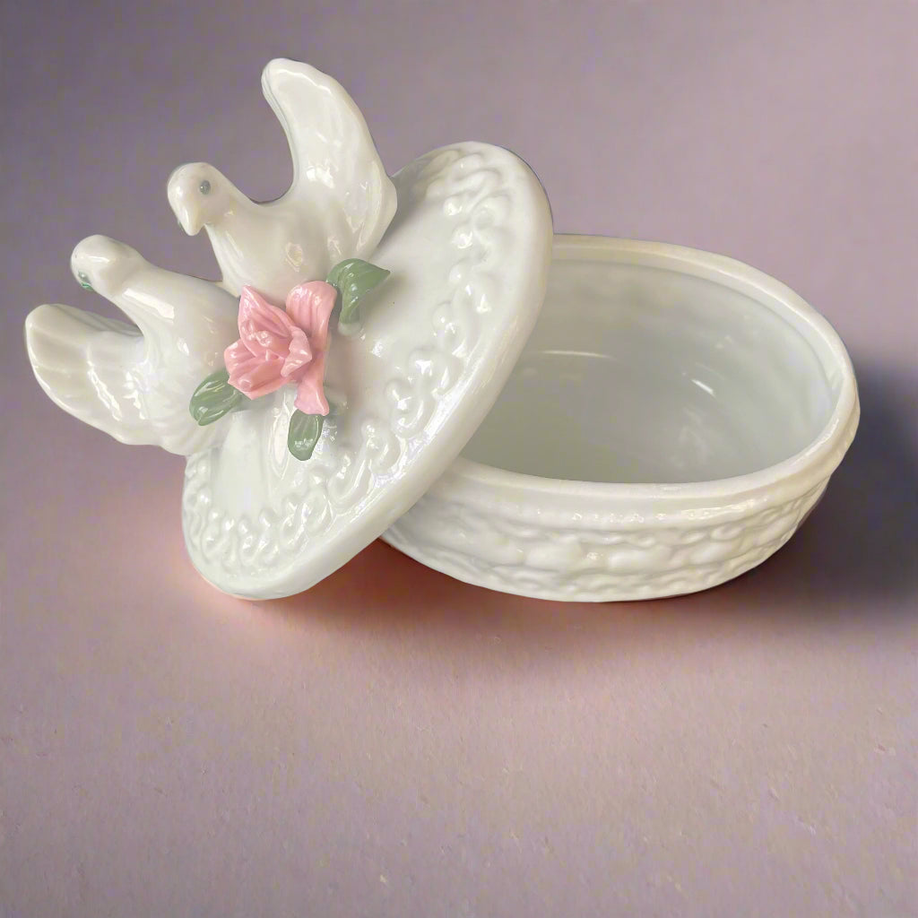 Vintage White Porcelain Trinket Box with Doves and Pink Rose