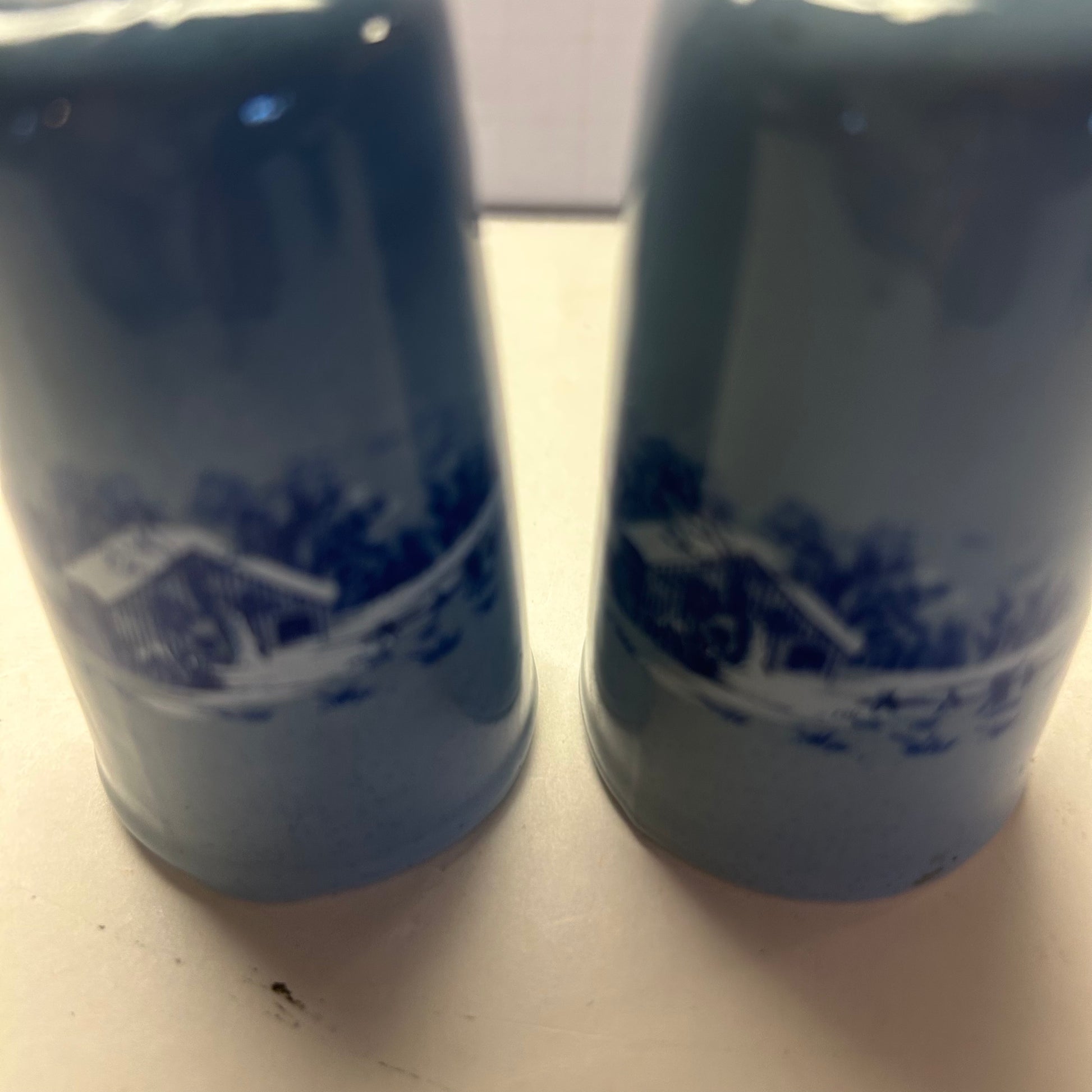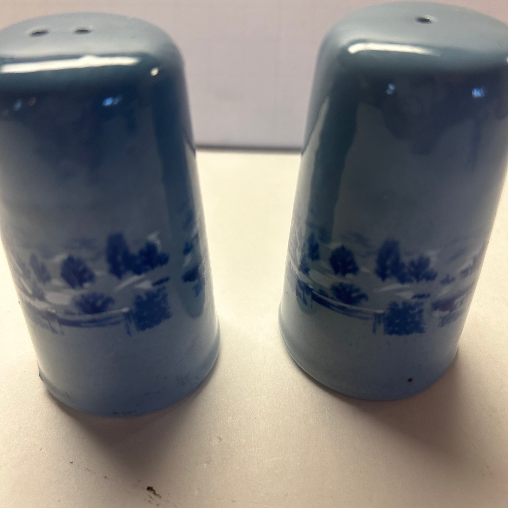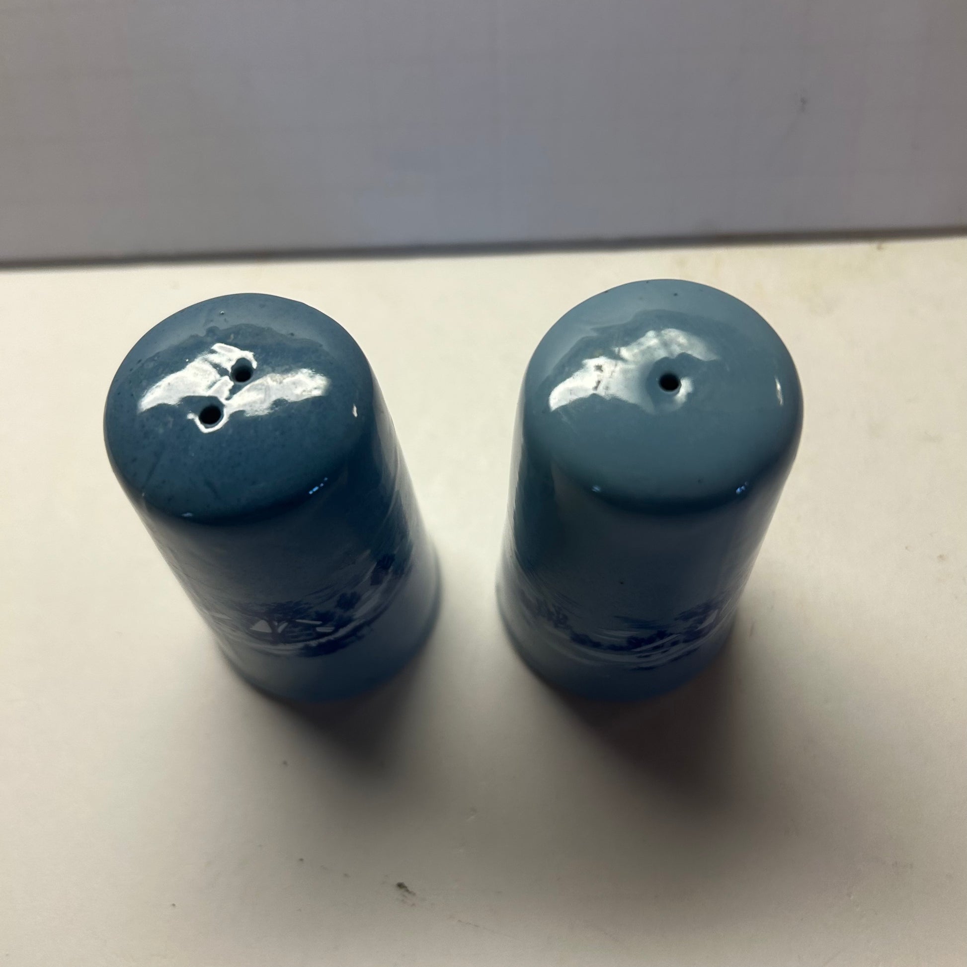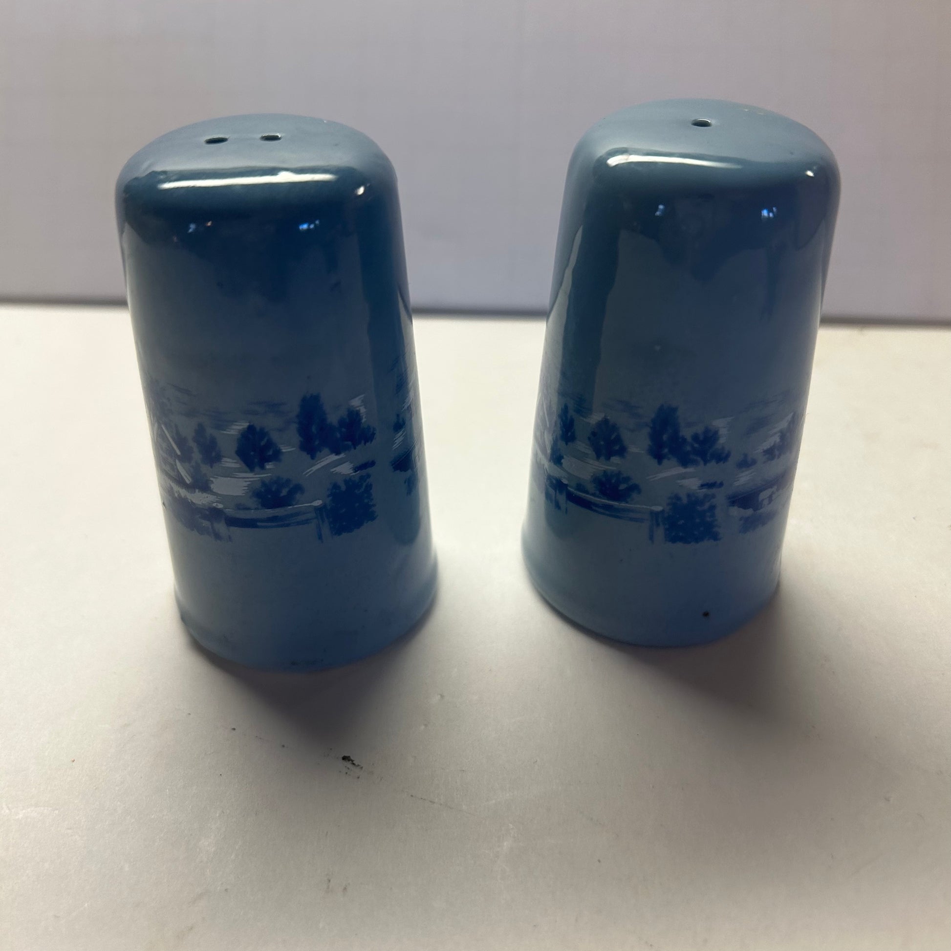Blue Ceramic Salt & Pepper Shakers w/ Winter Lake House Design