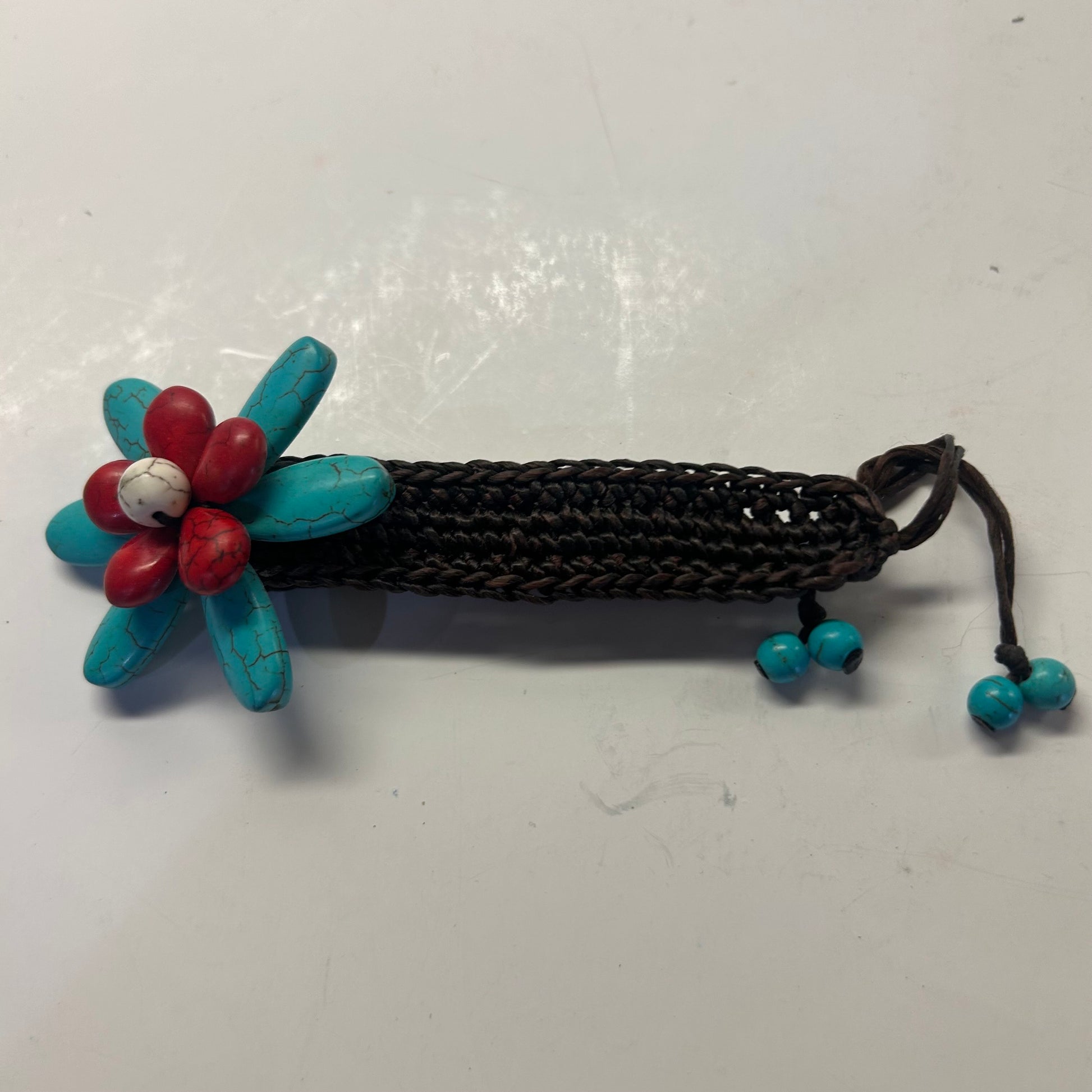 Turquoise and red floral Bracelet w/ Black braided band(adjustable size)