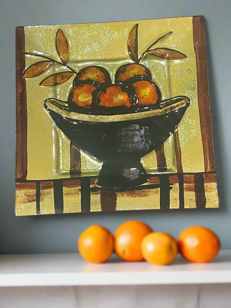 Large Square Decorative Glass Plate with Oranges in Black Pedestal Bowl