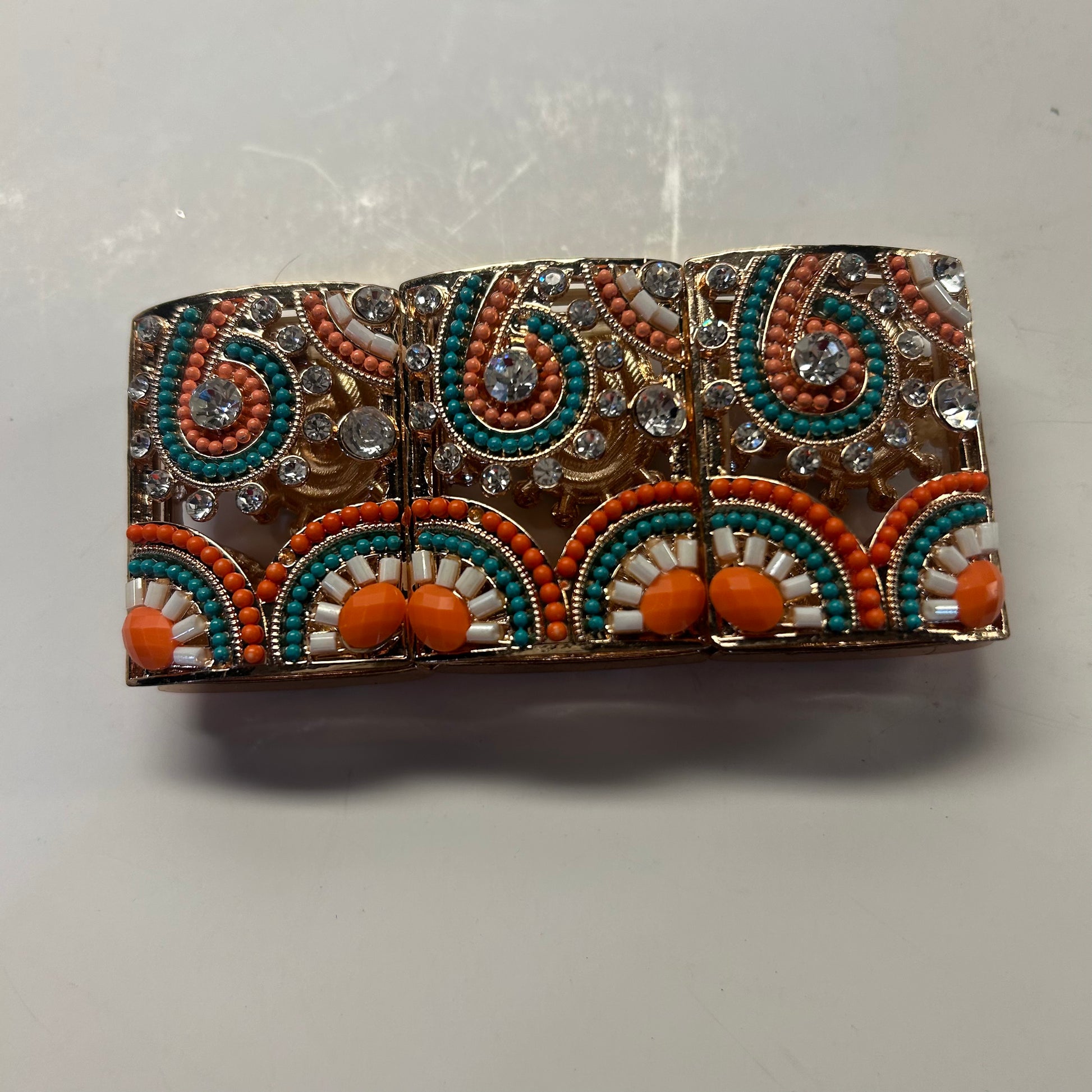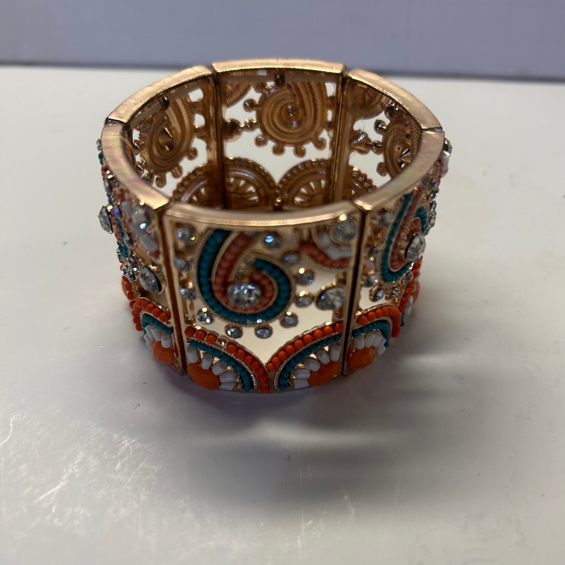 Orange Turquoise and Gold Paisley and Floral Design Bracelet (Lg size)stretch