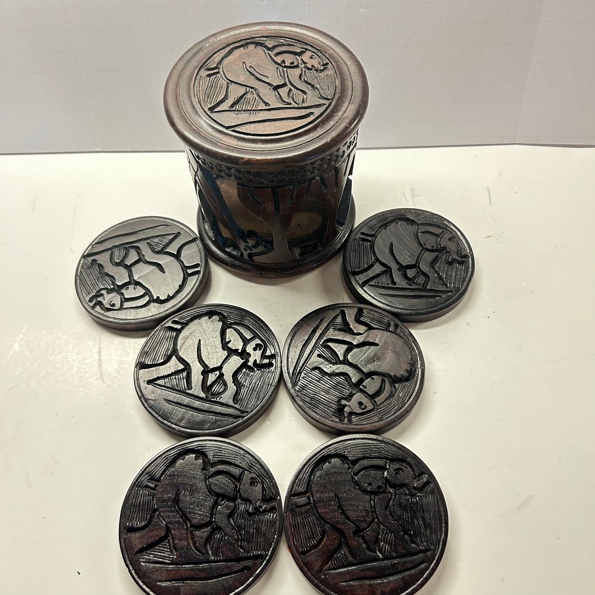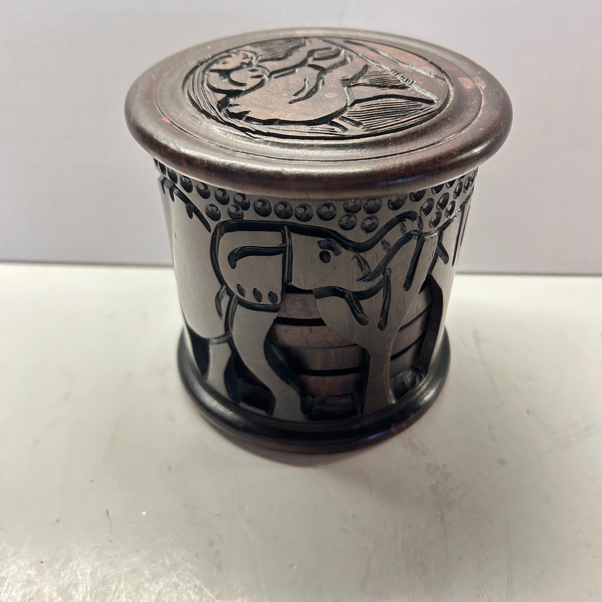 Hand Craved Elephant Coasters in Carved Holder (Dark Wood)