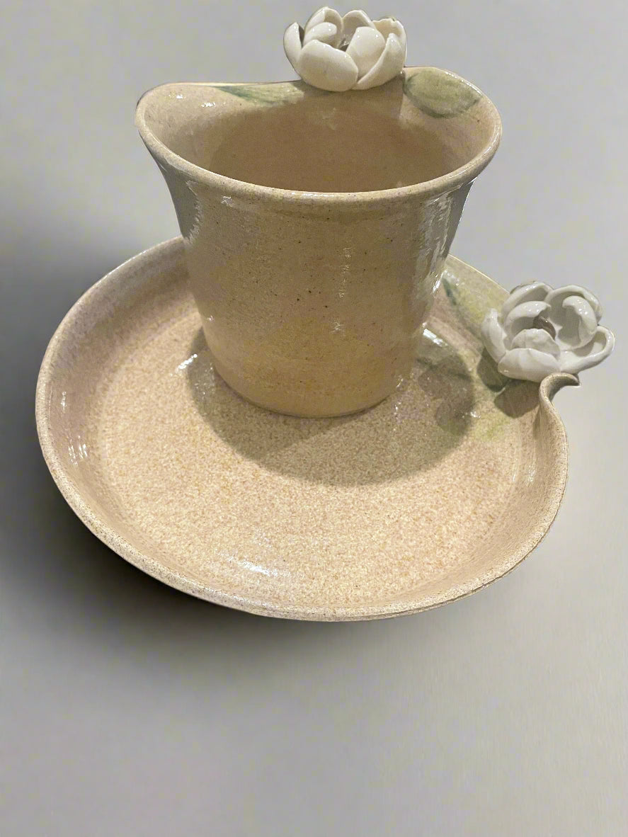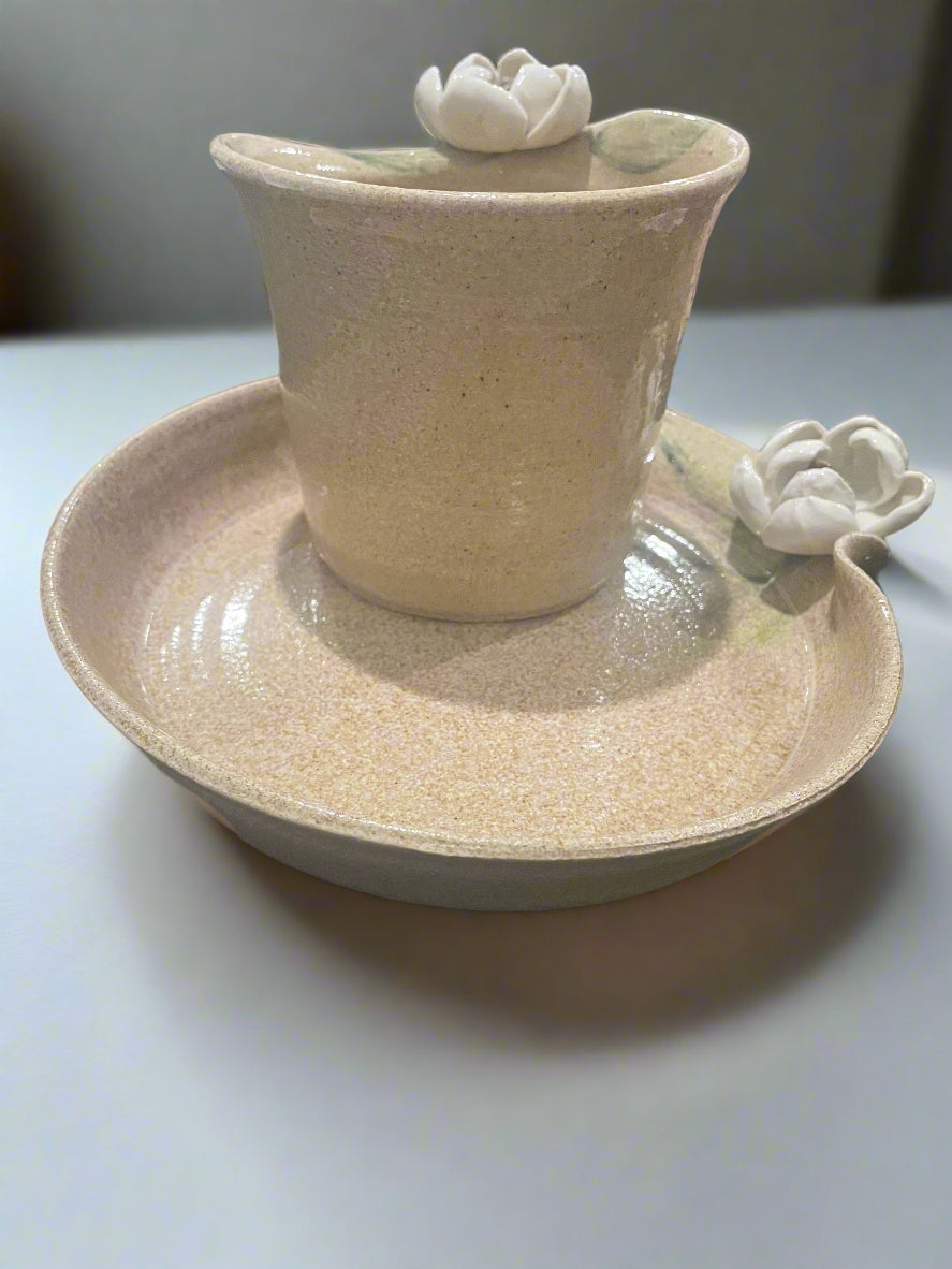 Original Handmade Pottery Bowl & Plate Sand Brown w/ White Flowers