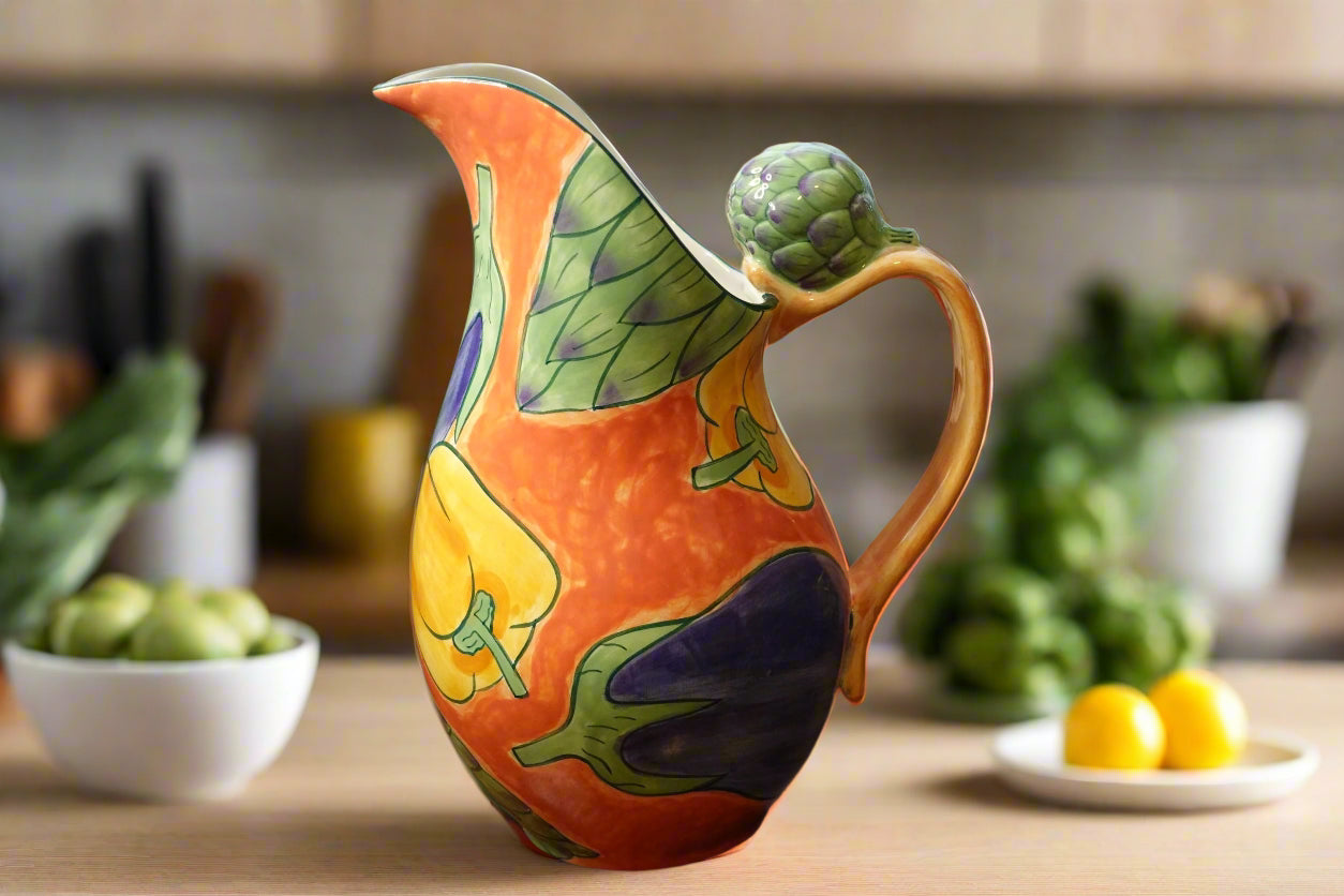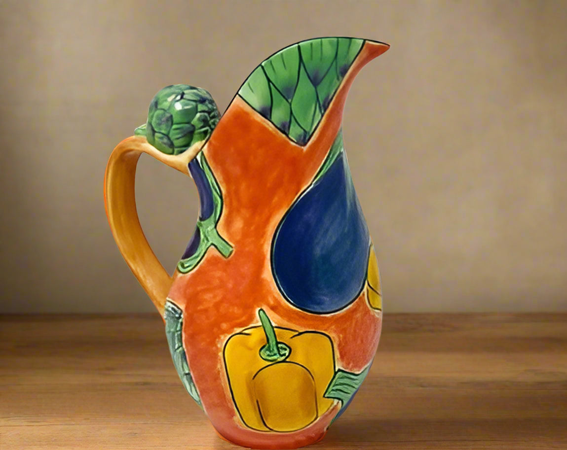 Indulge in summer vibes with our Hand Painted Pitcher Vegetable Theme! Featuring a vibrant vegetable-themed design, this pitcher is hand-painted with an eye-catching artichoke handle. Perfect for serving up delicious drinks, this pitcher adds a touch of whimsy to any table setting. Bring home the perfect combination of beauty and function today!
