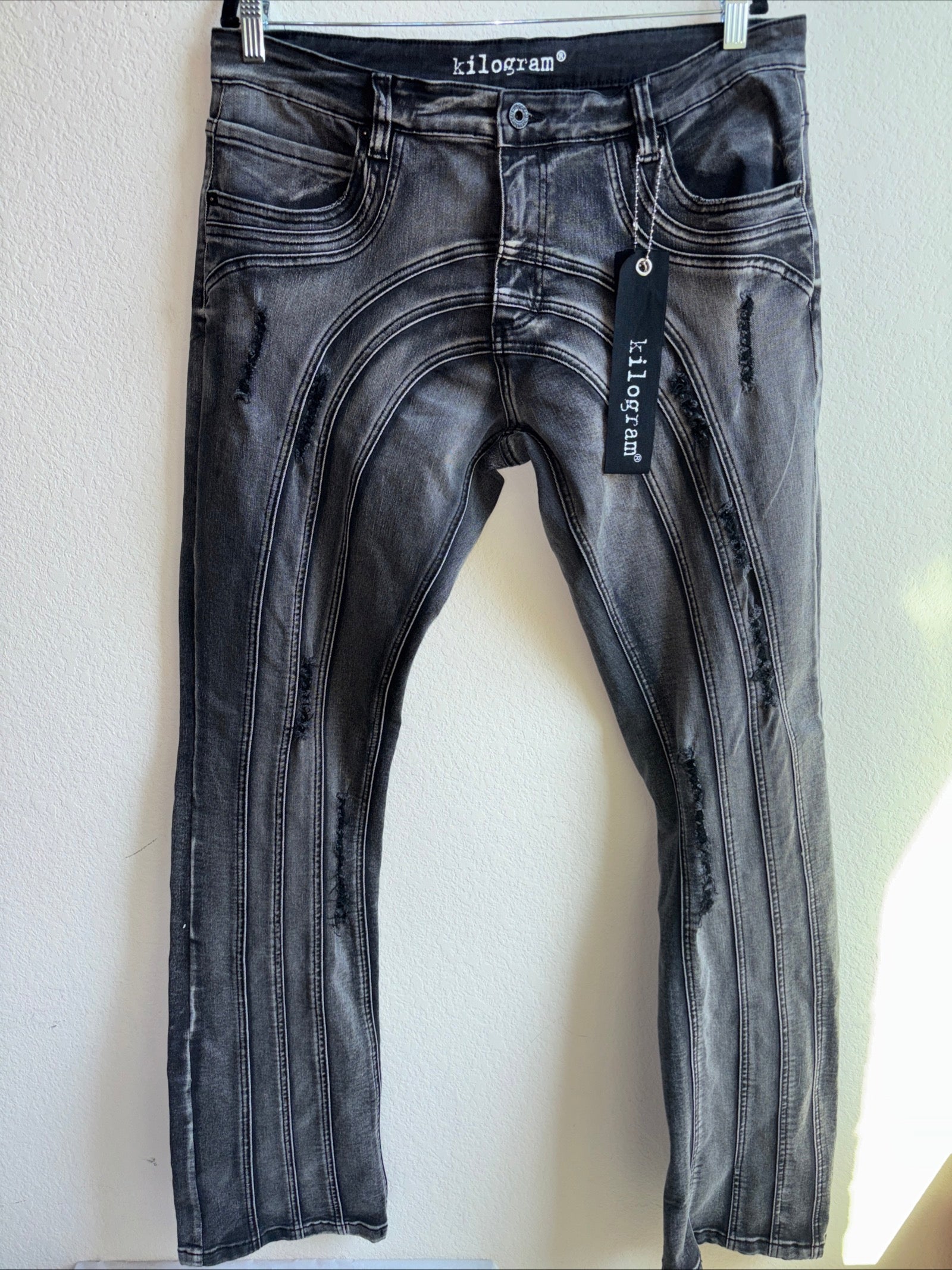 "These Kilogram men's size 36 black stone wash jeans provide both comfort and style with their acid wash denim and wide leg stretch. Perfect for any occasion, these jeans are a must-have for any fashion-forward man looking to elevate their wardrobe. Stay on-trend and comfortable with Kilogram."