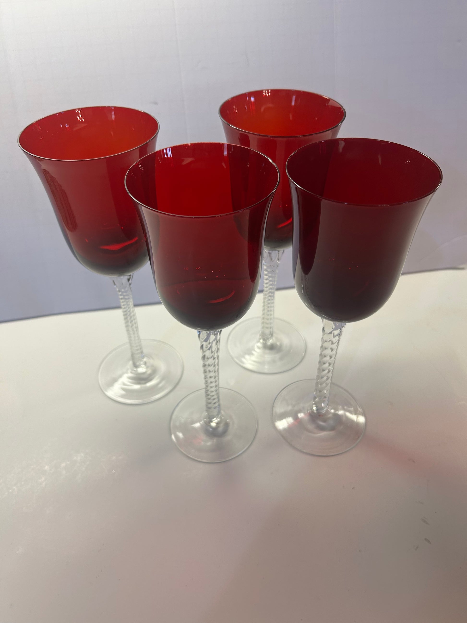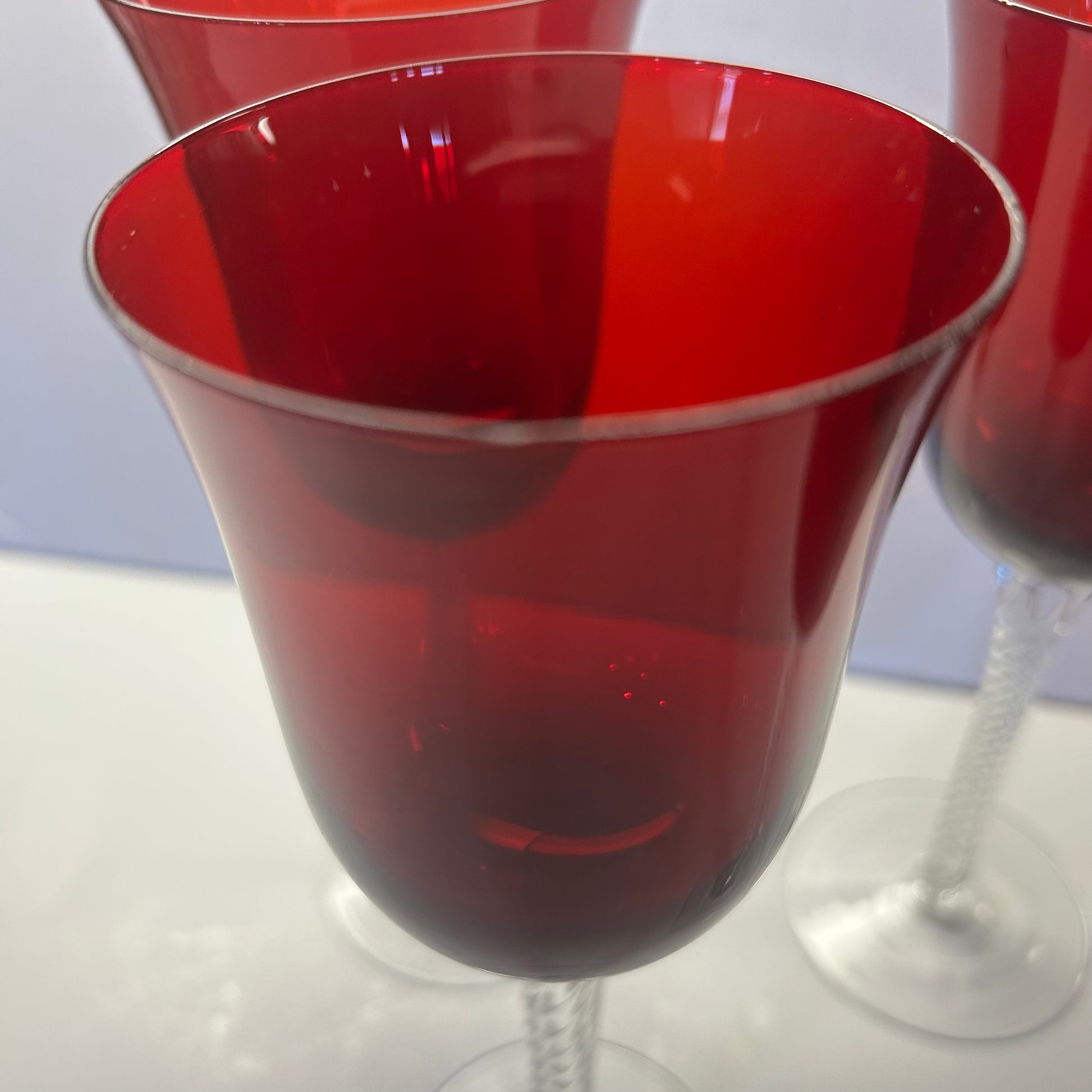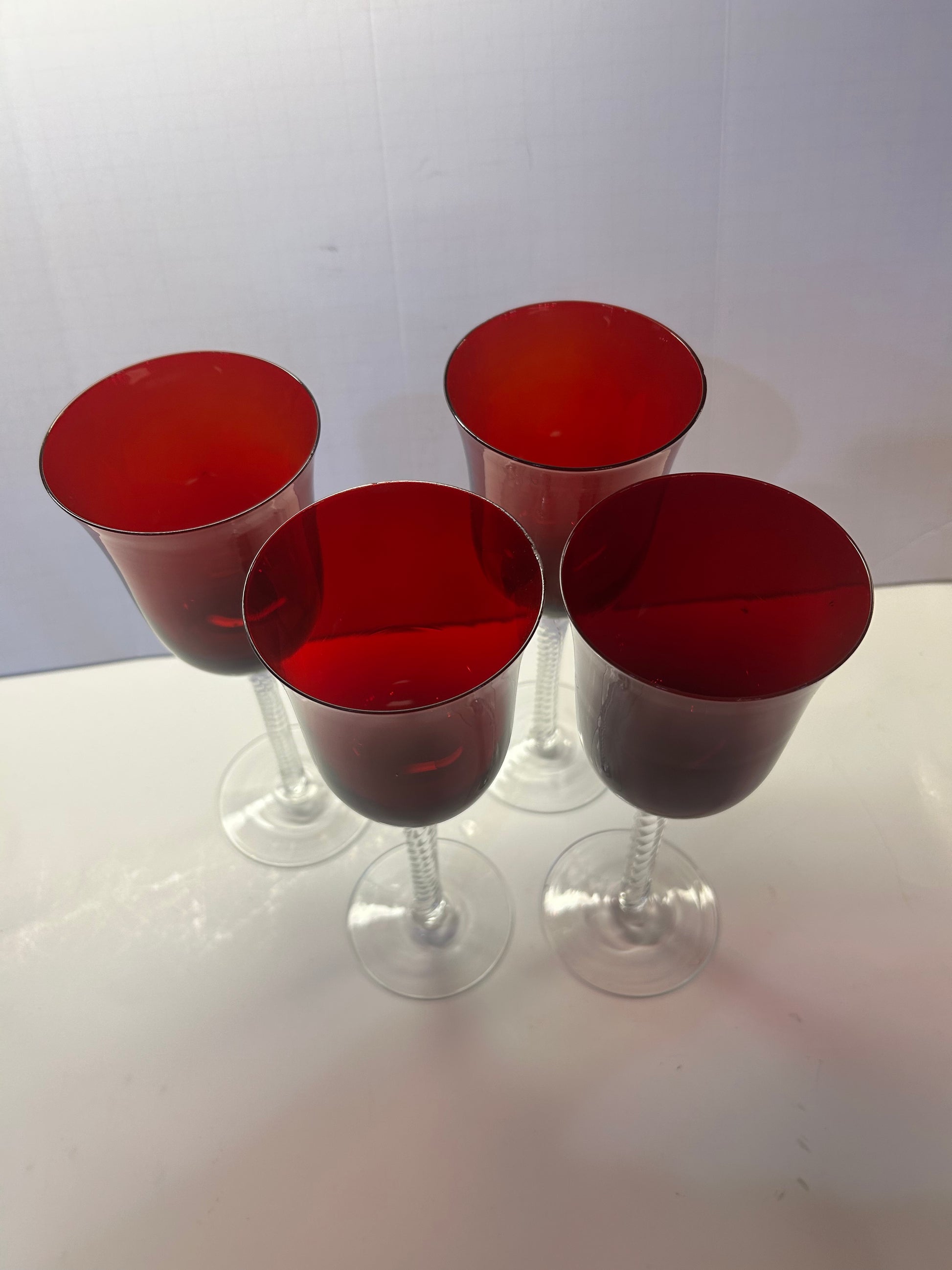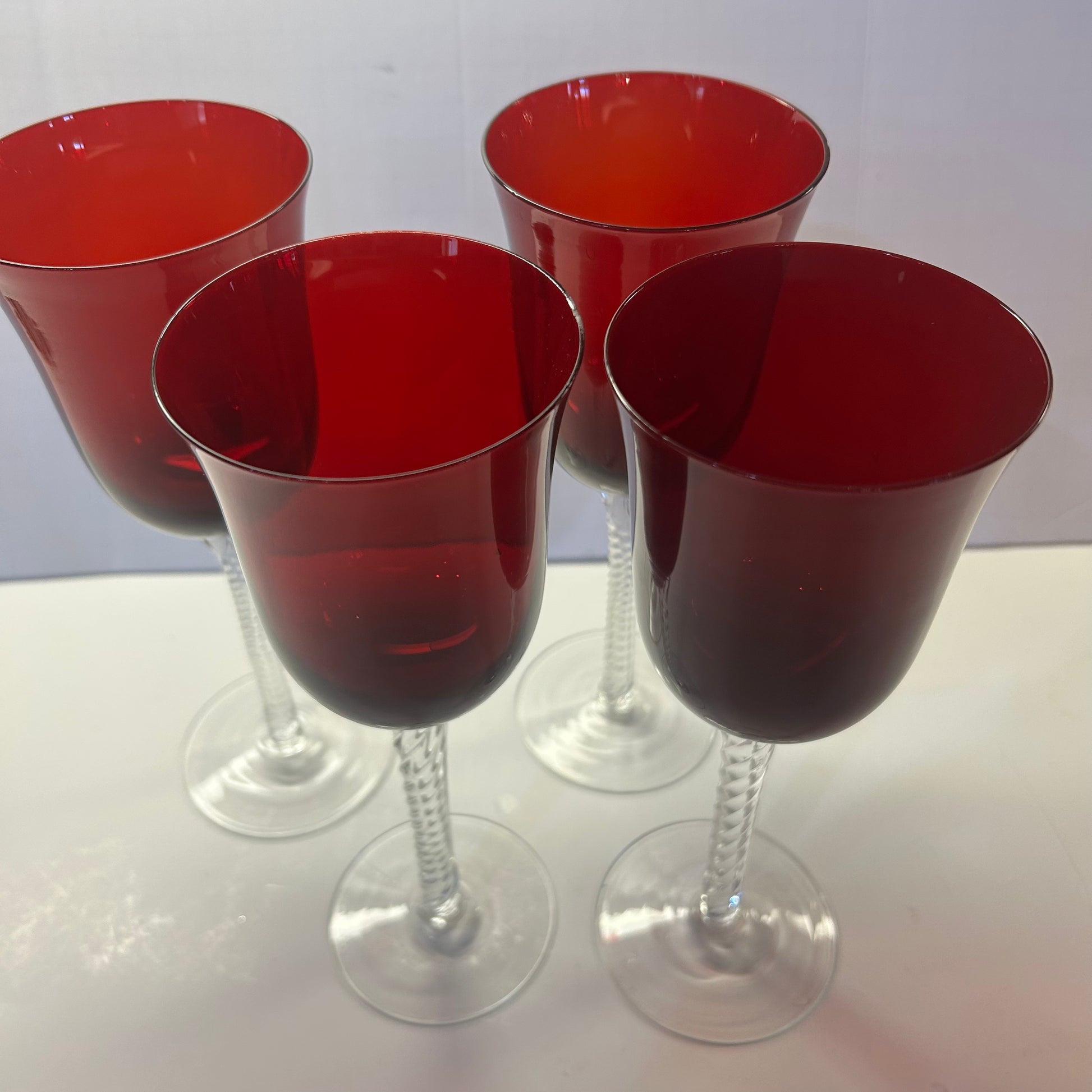 Vintage Amberina Ruby Red Wine Goblet Glasses w/ Clear Spiral Twist Stem Design (set of 4)