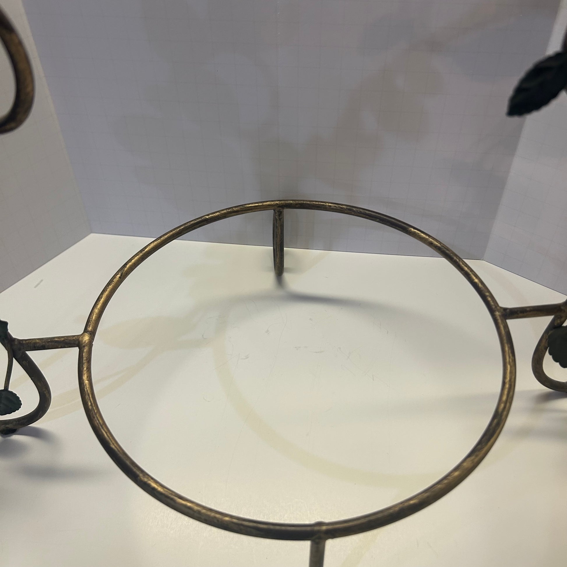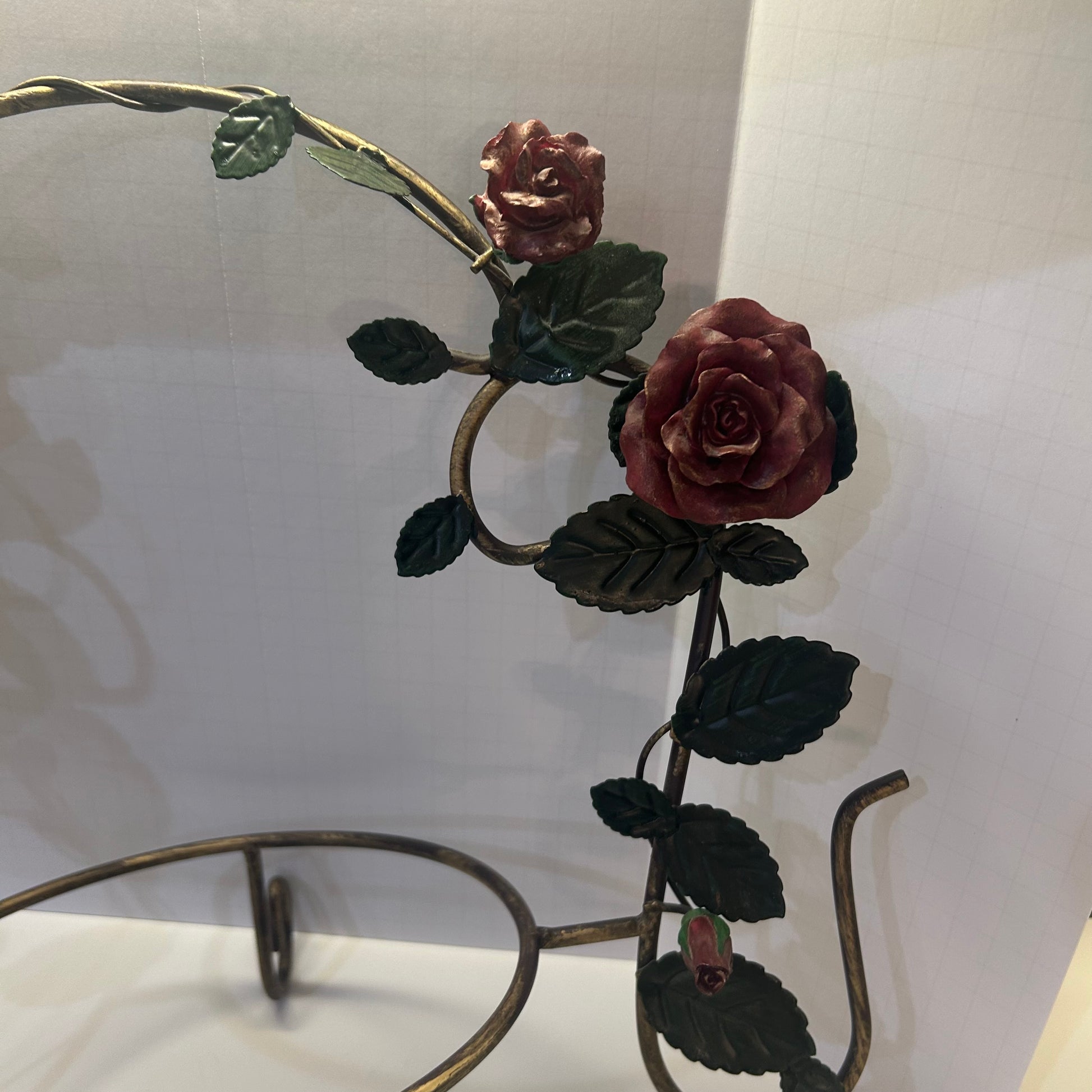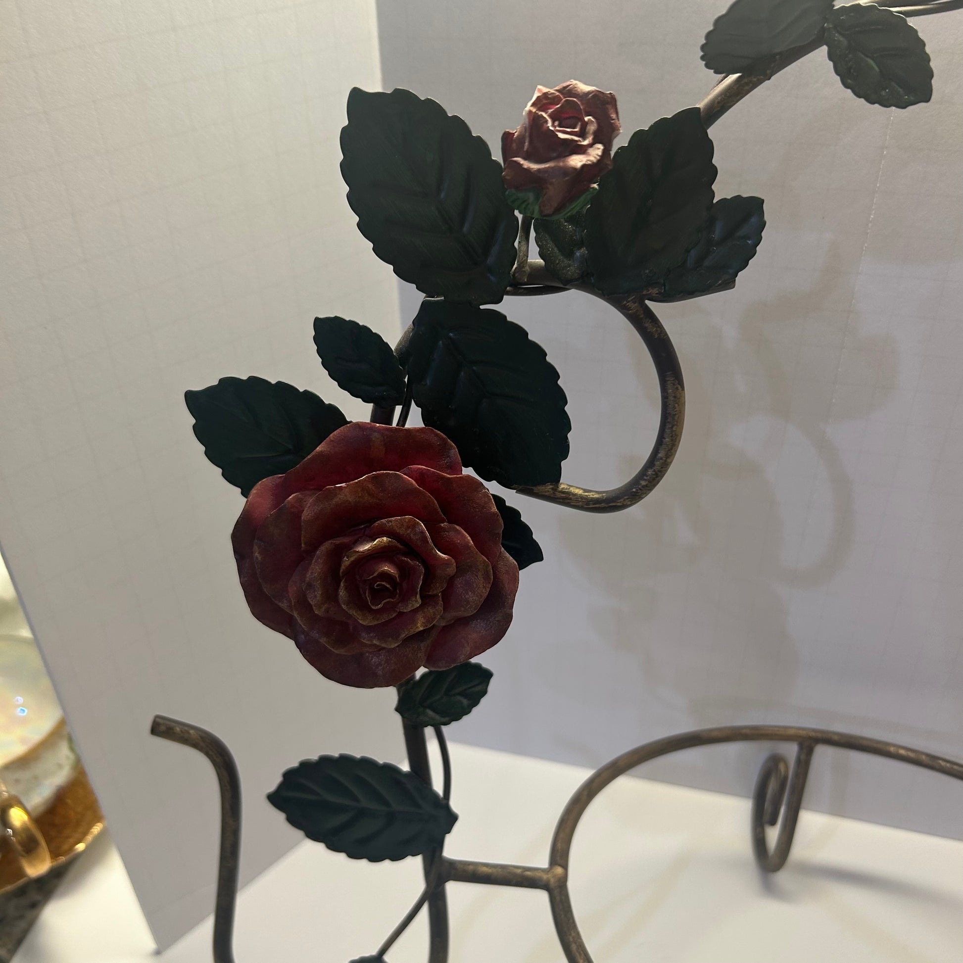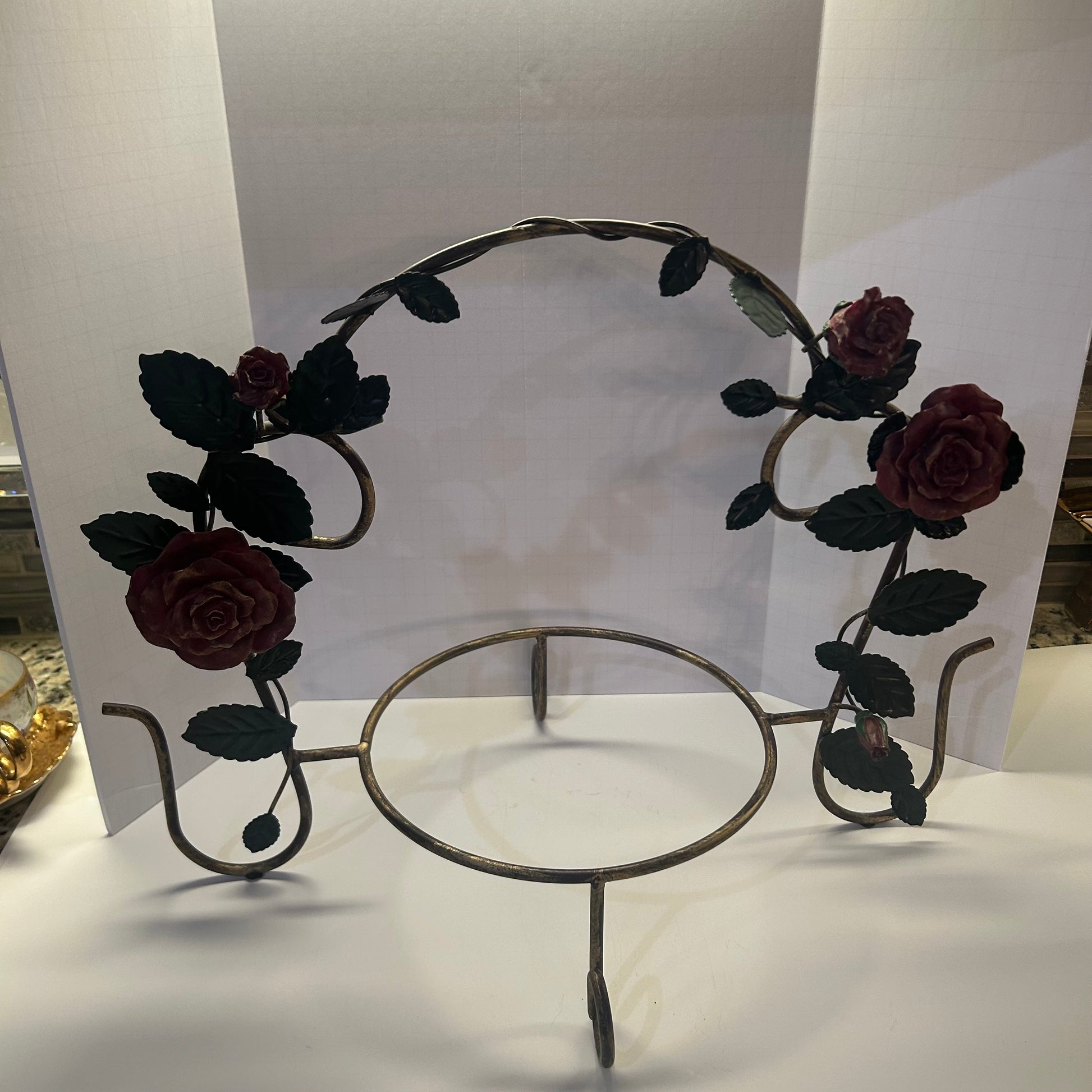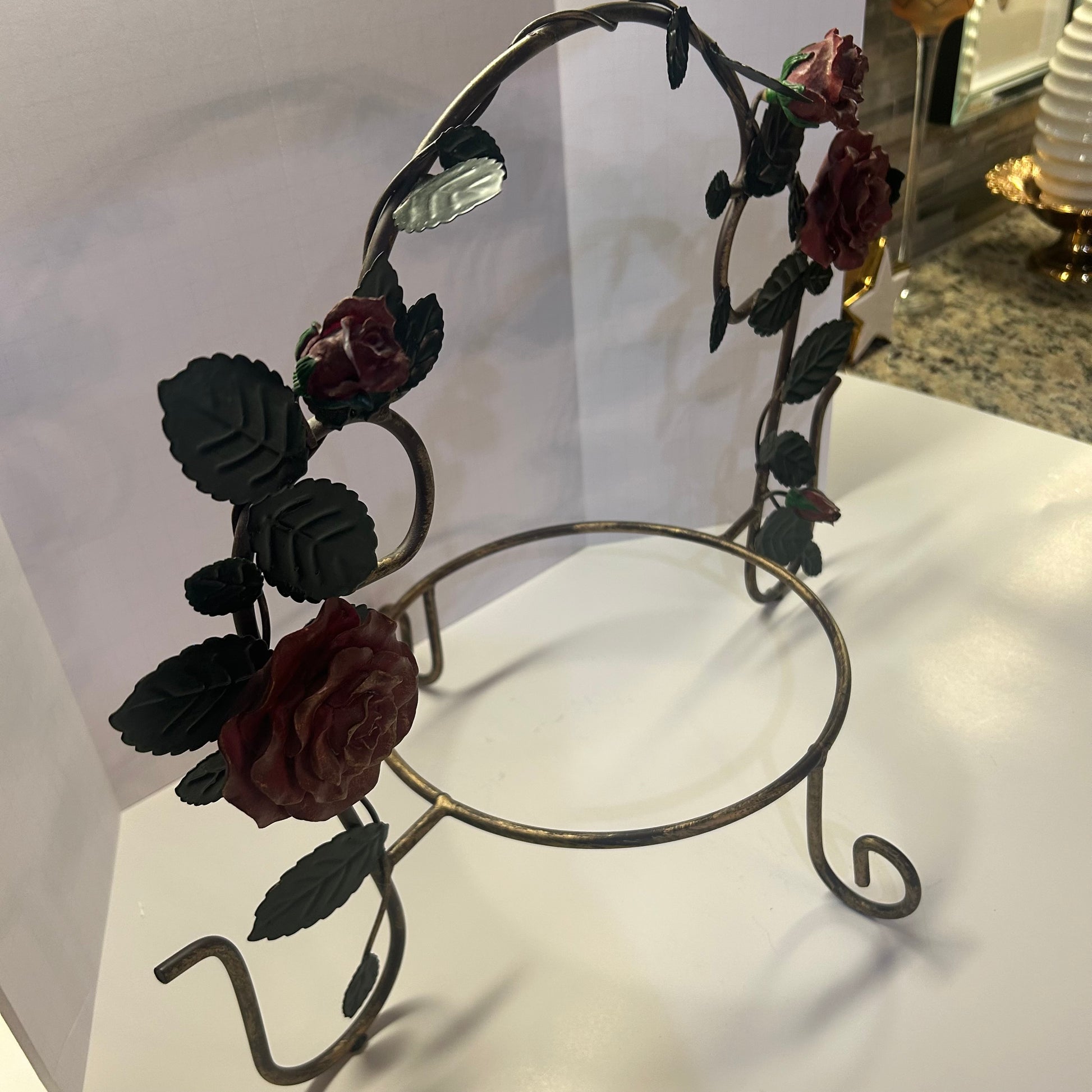 Introducing our rustic metal plate holder, elegantly crafted to beautifully display your plates. Adorned with a striking red rose and delicate green leaf design, it adds a touch of sophistication to any table setting. A must-have for any lover of vintage charm and timeless beauty.