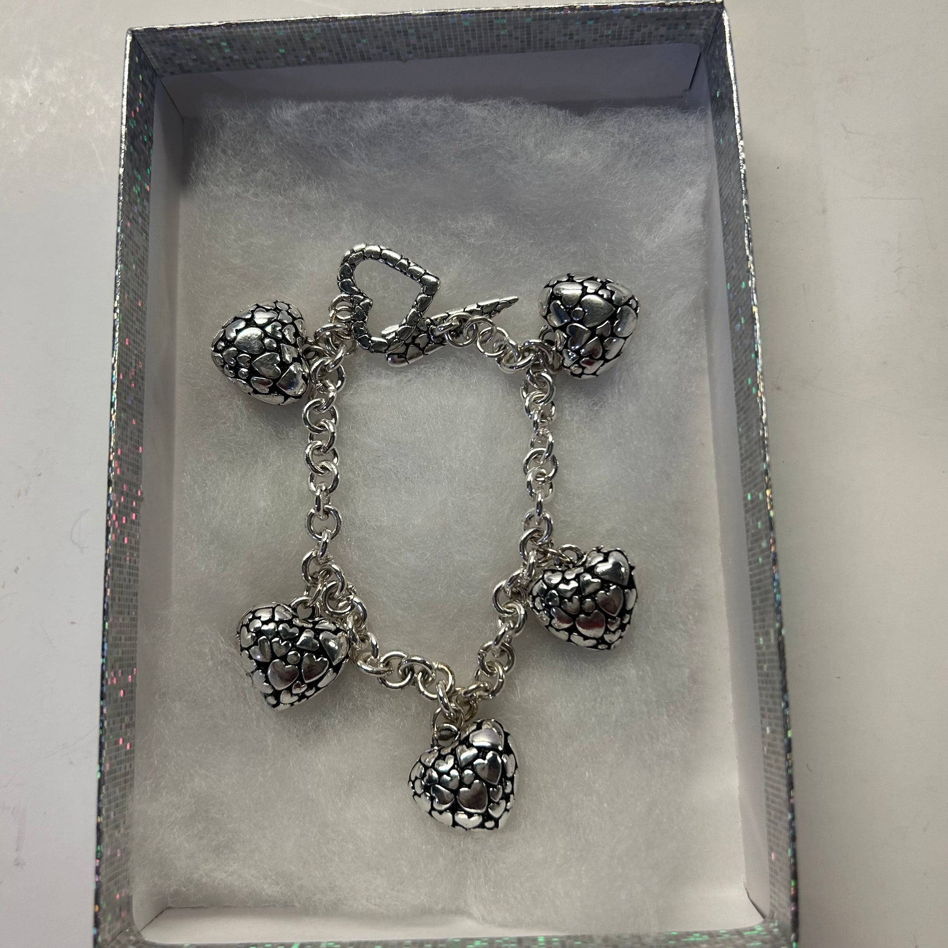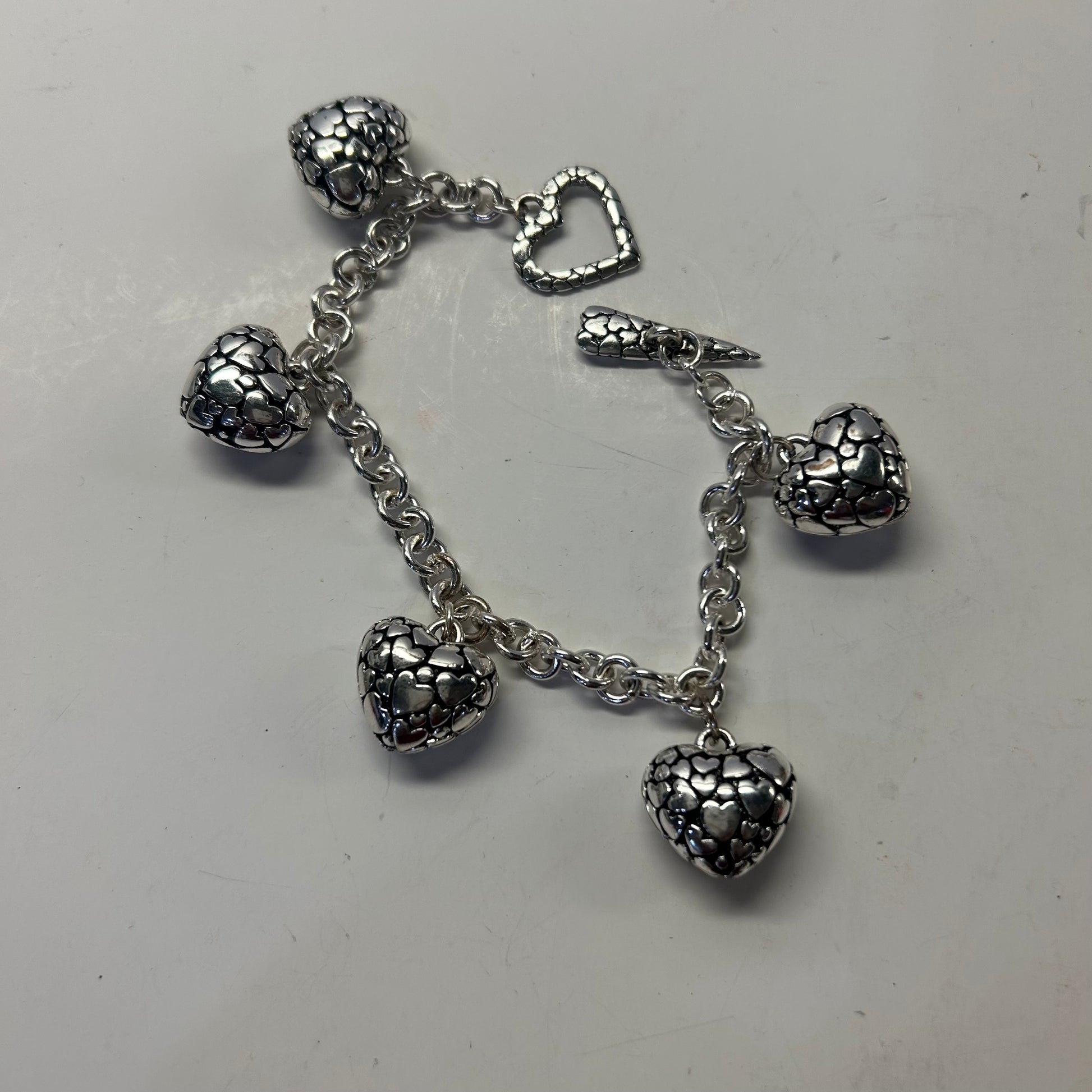 This silver bracelet is a stunning addition to any accessory collection. The intricate heart charms add a touch of romance, making it perfect for any special occasion. This bracelet is durable and will last for years to come. A timeless piece that will elevate any outfit.
