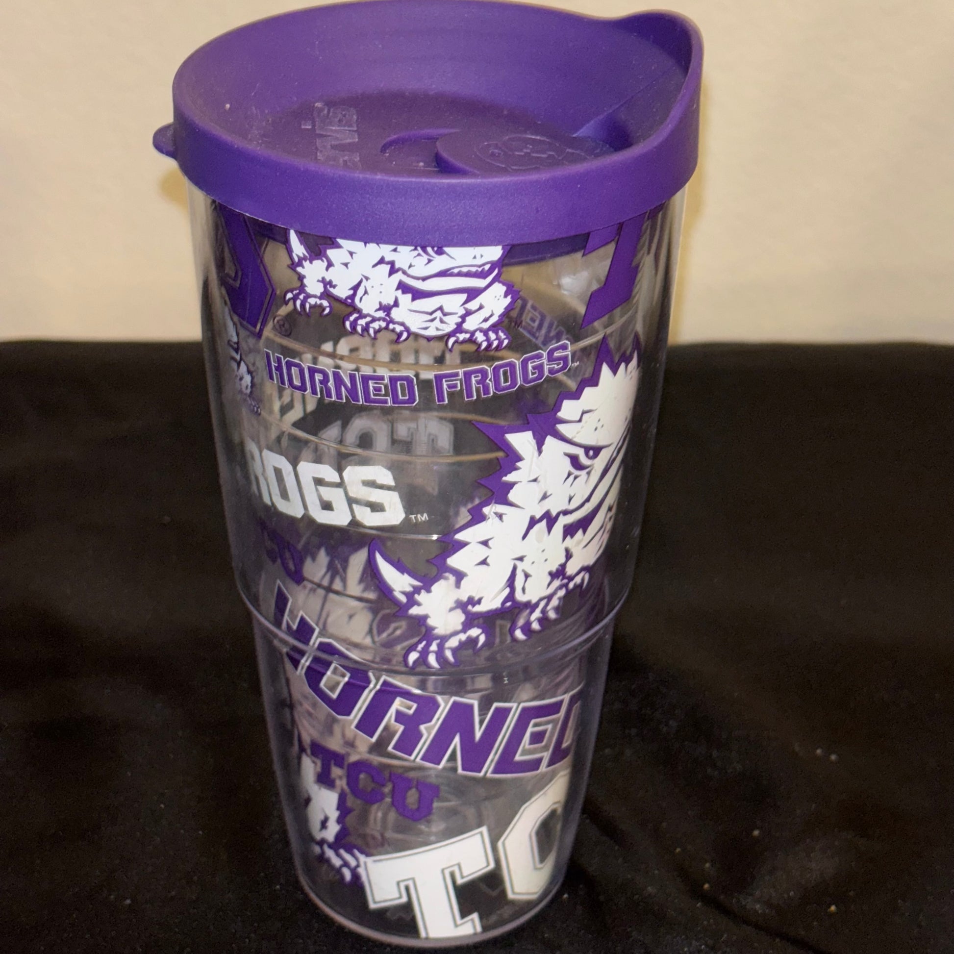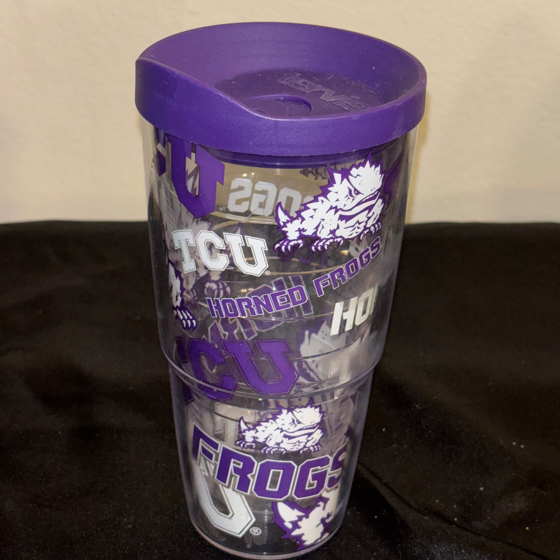 Represent your college spirit on the go with the Tervis TCU Hornfrogs large Plastic Tumbler. This portable and durable tumbler lets you enjoy your favorite beverages while showcasing your school pride. Perfect for any occasion, it's a must-have for any college student or superfan. Go Horned Frogs! Good Condition