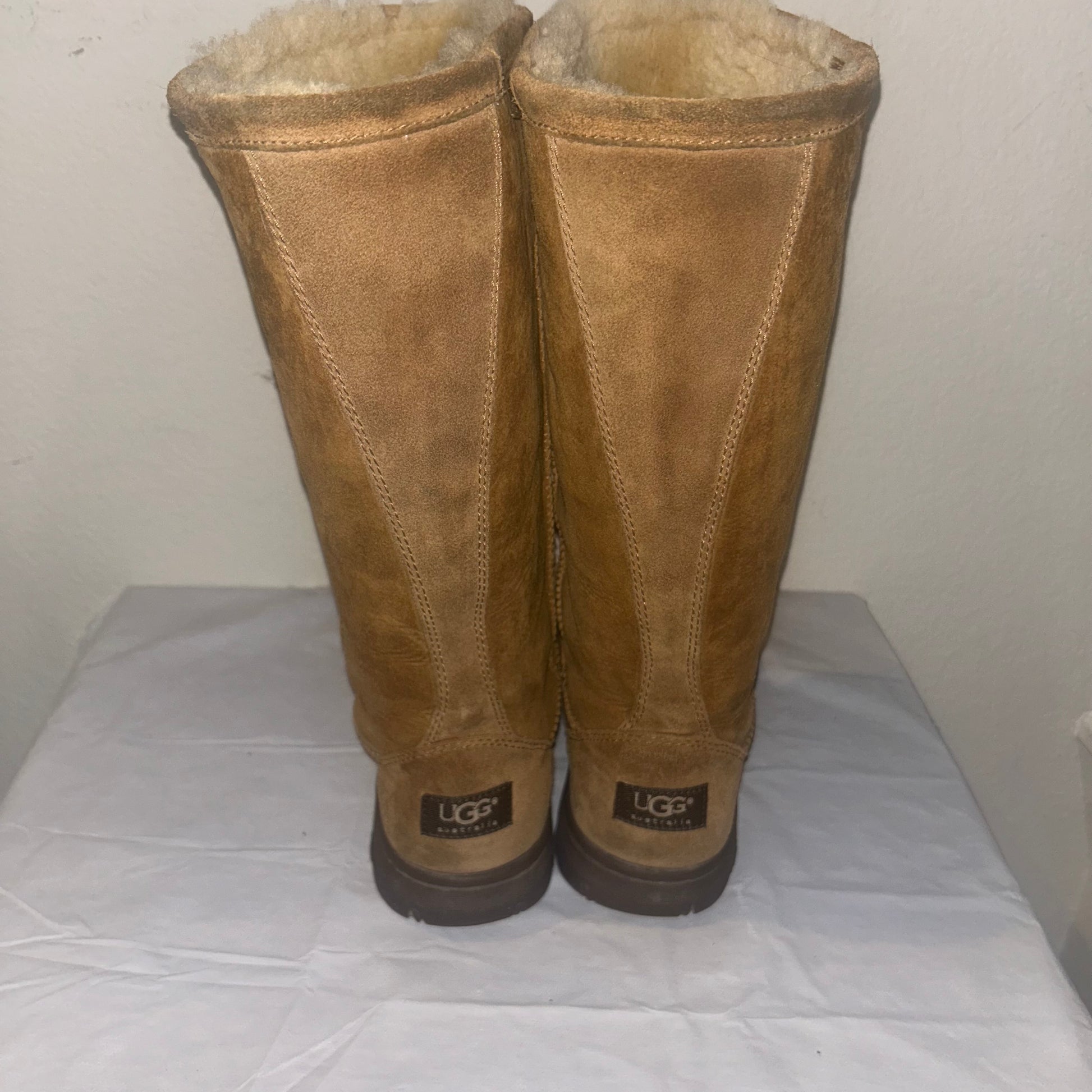 These knee-high tan fur boots, made by Uggs, offer both comfort and style. With their soft, warm fur lining and trendy design, they are the perfect addition to any winter wardrobe. Available in women's size 9, they are sure to be a cozy and fashionable choice for the colder months.
