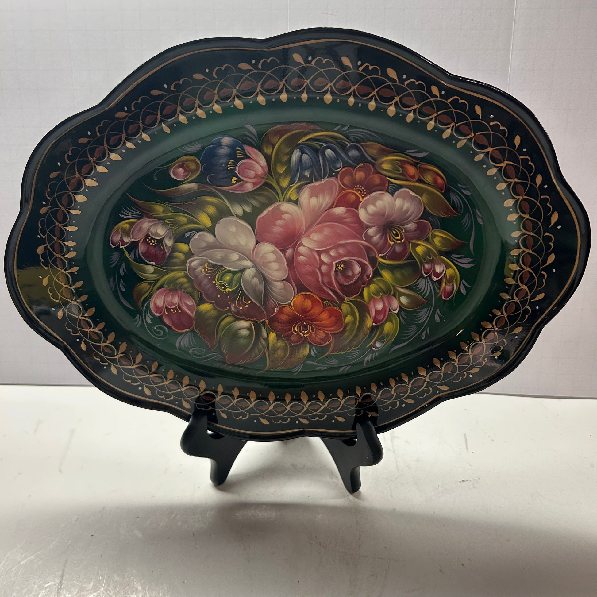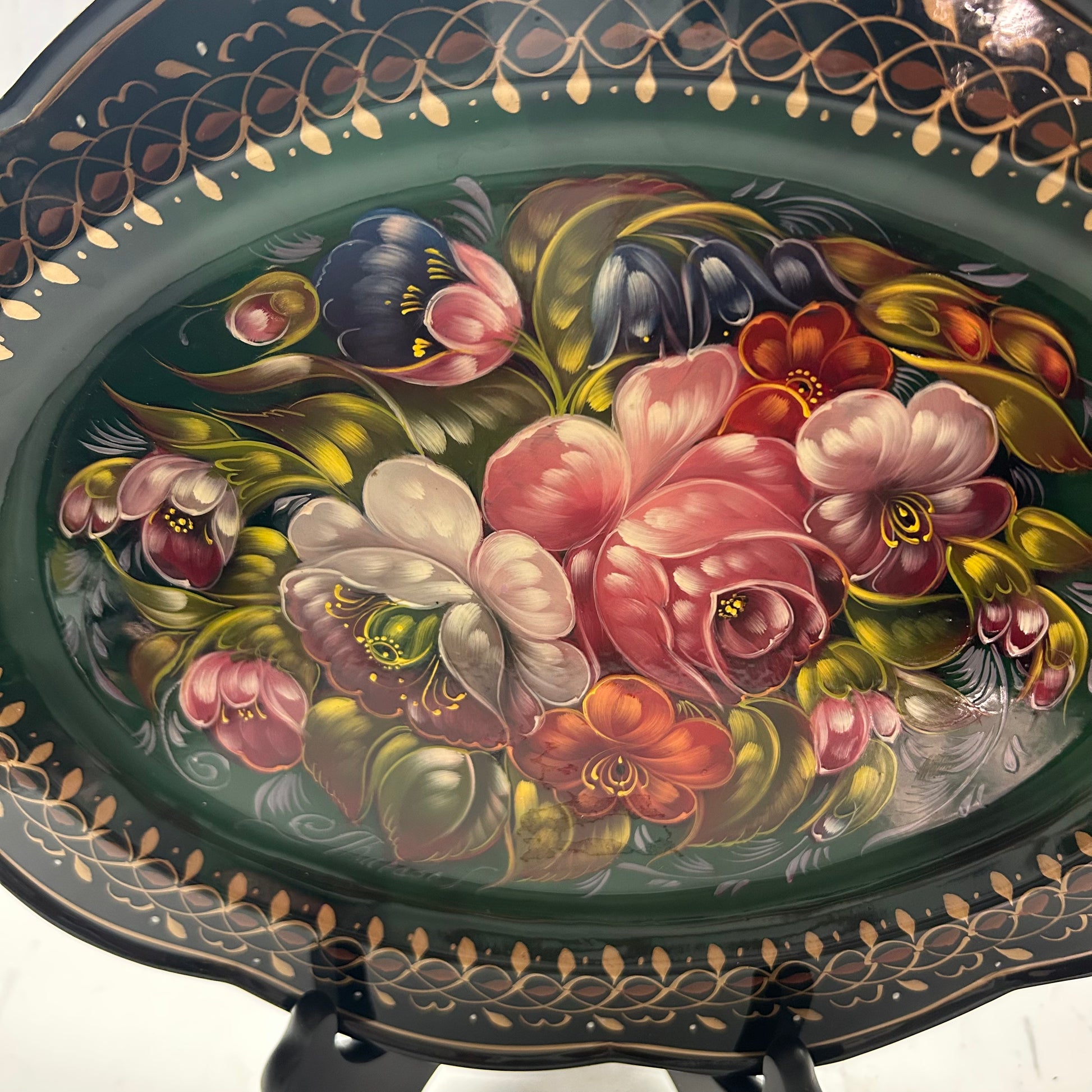 Vintage Hand Painted Russian Metal Tray Floral Design