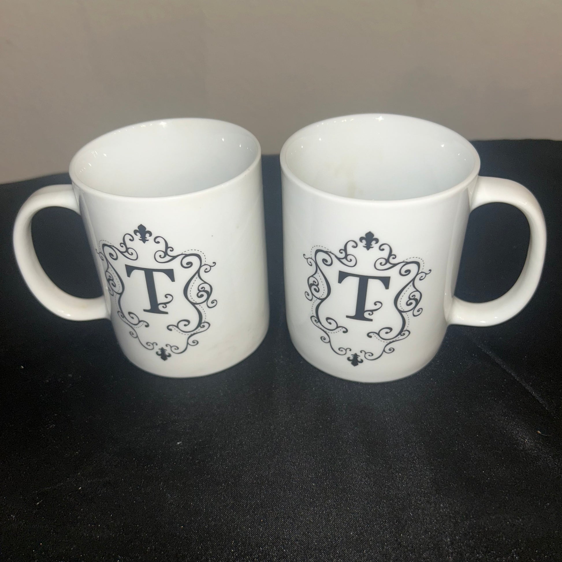 These 12 oz White Monogram mugs “T” are the perfect addition to any home. Each set comes with two stylish and cozy mugs, personalized with the letter "T". Made from high-quality materials, these mugs are not only elegant but also durable. Start your day with a touch of personalization and enjoy your favorite beverage in these mugs. Good condition