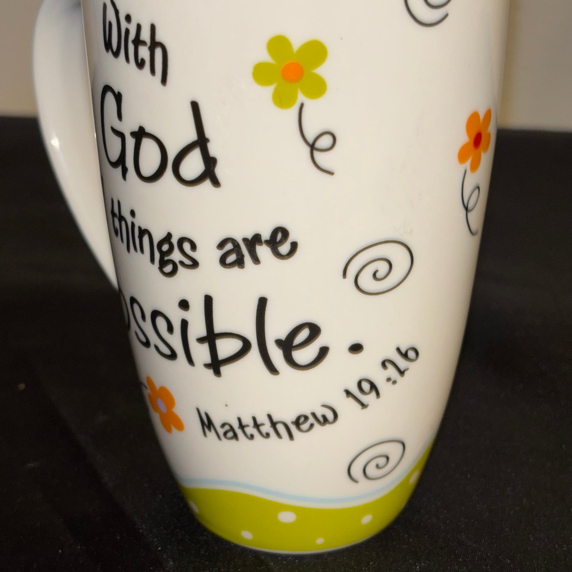 White multicolor, ceramic coffee mug “ faith with God, all things are possible”