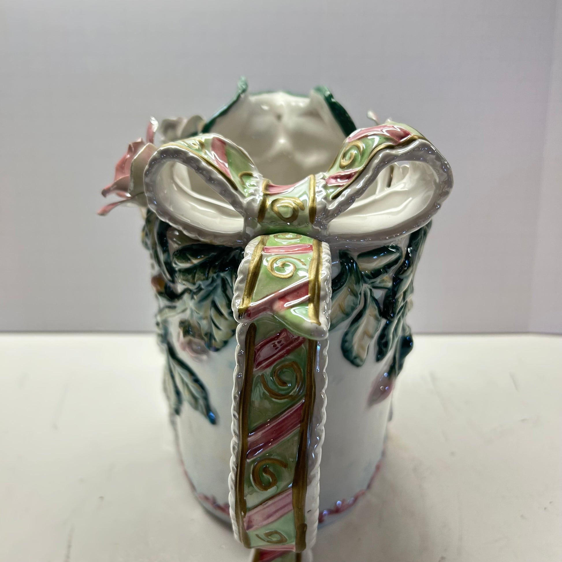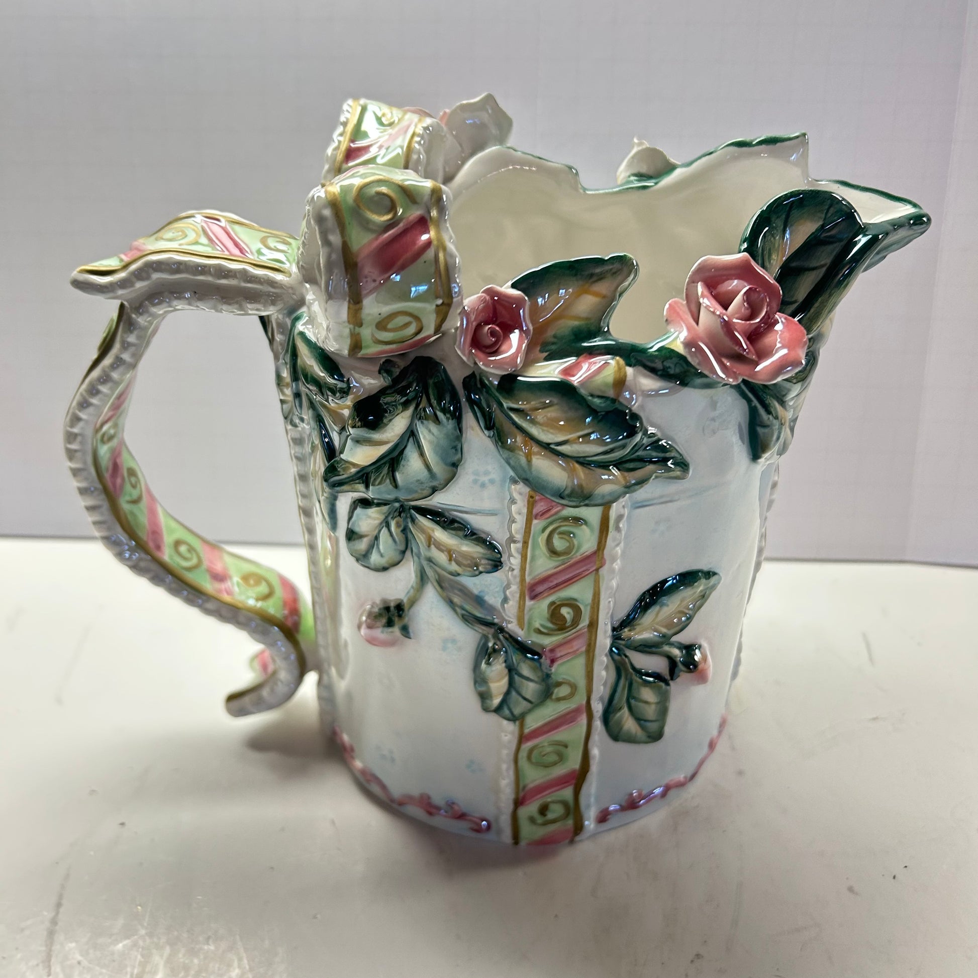 White pink and green Porcelain ceramic floral and ribbon bow design pitcher