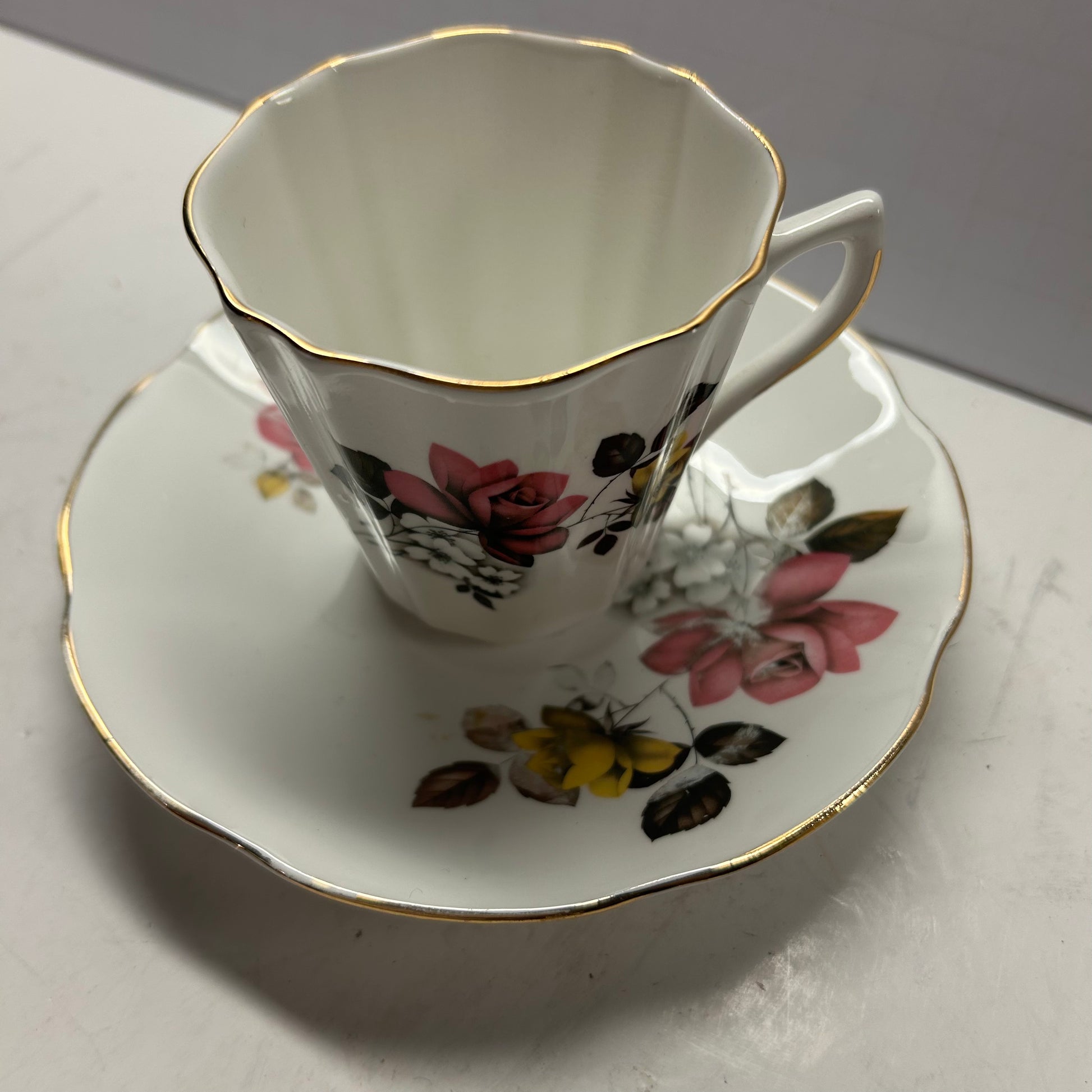 White and Pink Floral Design Tea Cup & Saucer with Gold Rim